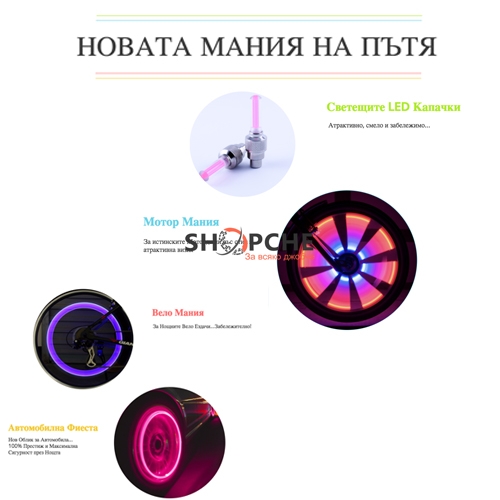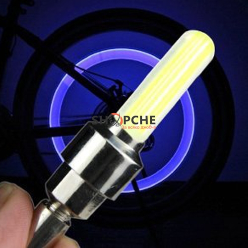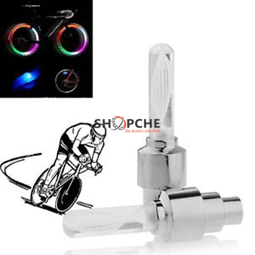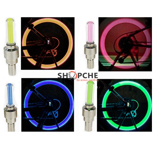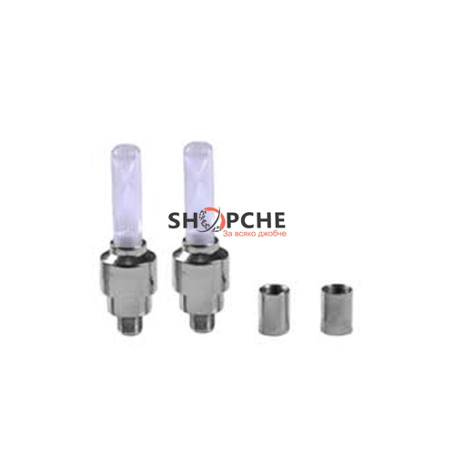 Предлагаме Ви комплект от два броя светещи капачки за вентилите на автомобил, мотоциклет или велосипед в преливащ цвят! ( при движение цветовете се сменят автоматично и ефектът е "дъга"!)