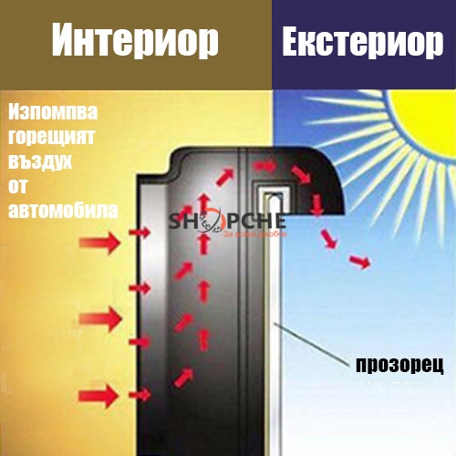 Този продукт е със соларно захранващ се вентилатор, който поддържа купето на паркирания Ви автомобил, прохладно и свежо.