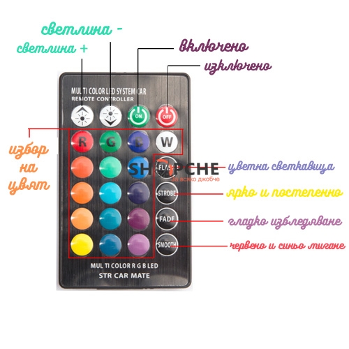 С безжичното дистанционно управление можете да настроите цвета на светлината за червено, зелено, синьо, бяло и др.