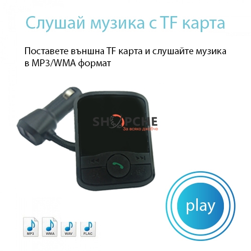 Поддържа външна TF карта SD/MMC ,което Ви позвлява да произвеждате музикални файлове в MP3/WMA формат с кристално качество на звука или да се насладите на радио канали.