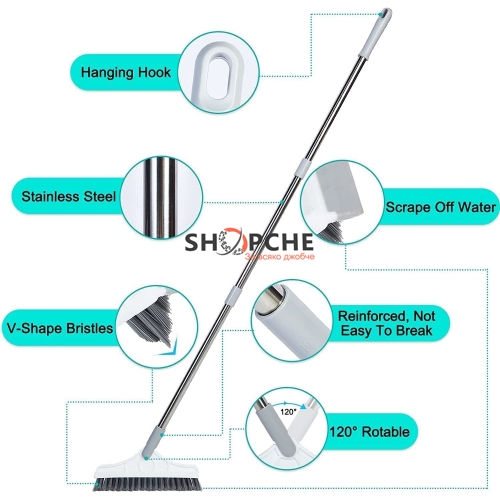 Четки за почистване на под с твърд косъм: Четката за почистване е направена от PP материал и желязо, здрава и издръжлива. Пръчките са затегнати чрез резбови съединения със заключване, няма нужда да се притеснявате за разхлабване, което е идеално за тежки замърсявания.