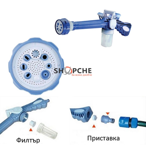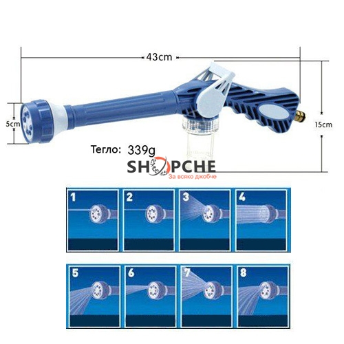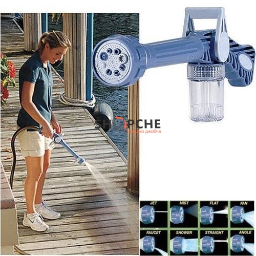 Използвайте Ez Jet Water Cannon за поддръжка на семейния автомобил. Ez Jet Water Cannon с 8 модела на пръскане притежава контейнерче, в което да добавите препарат или сапун.