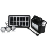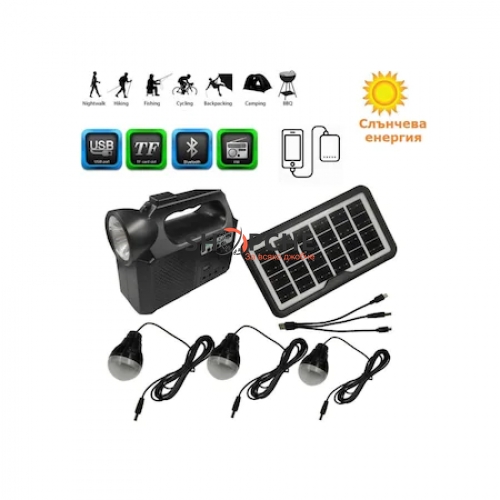 Соларна система CH LITE CH-8017MK включва соларен панел, акумулаторна батерия, фенер, 3 броя Led крушки, кабел за зареждане на различни телефони и презрамка за носене на рамо.
