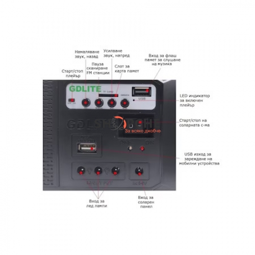 Акумулаторът може да се зарежда по два начина – в ел. мрежата на 220V или с помощта на соларния панел.