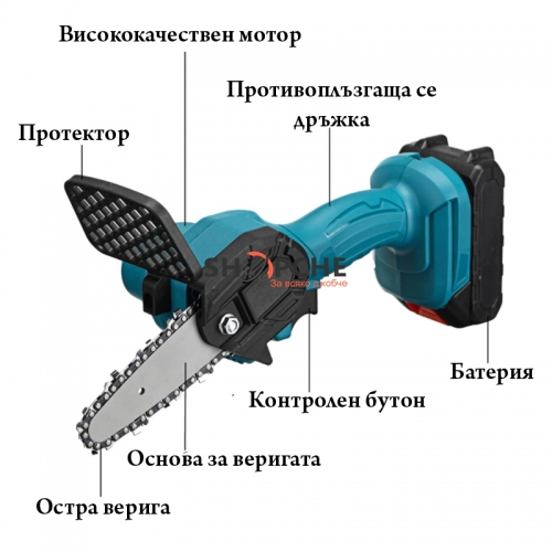 Електрическият трион разполага с литиево-йонна батерия 1500 mAh, до 100 разреза след пълно зареждане.