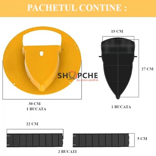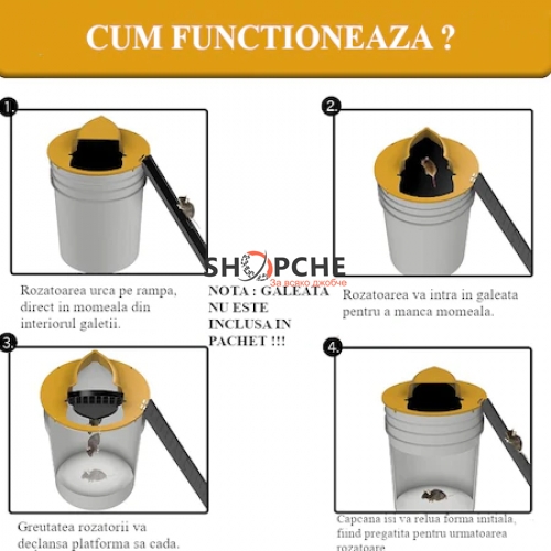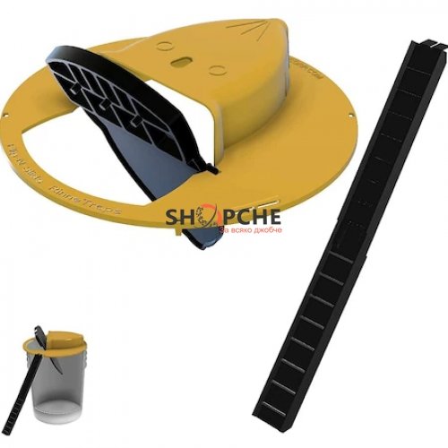 Капанът е предназначен да улови мишката вътре в кофата и те няма да могат да се измъкнат. Поставете тухлата вътре в кофата, така че да не я съборят. Забележка: Кофата не е включена в опаковката.