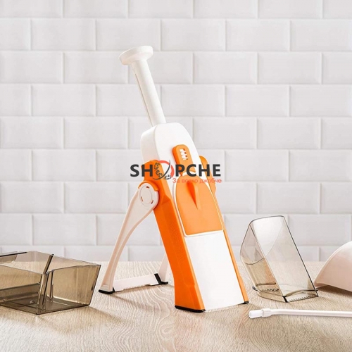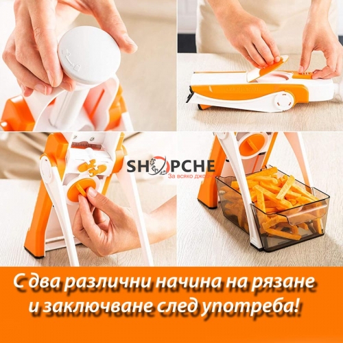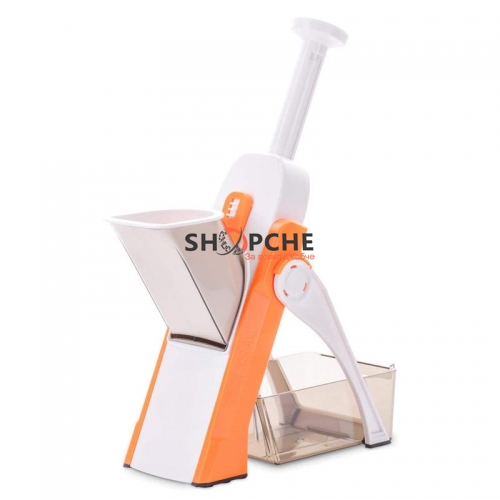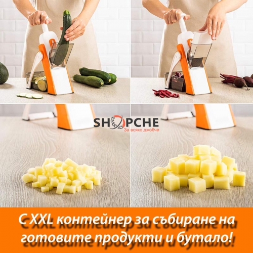 Моделът разполага с XXL контейнер за събиране на нарязаните продукти и избутвач, чрез който нарязвате целият продукт!