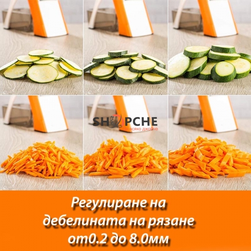 Настойте рендето на желаната от вас дебелина за рязане от 0.2 до 8.0мм и нарежете желаните от вас продукти бързо и безпроблемно!