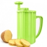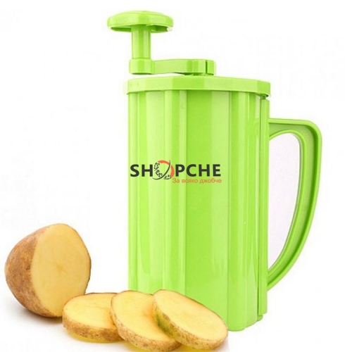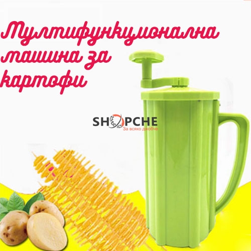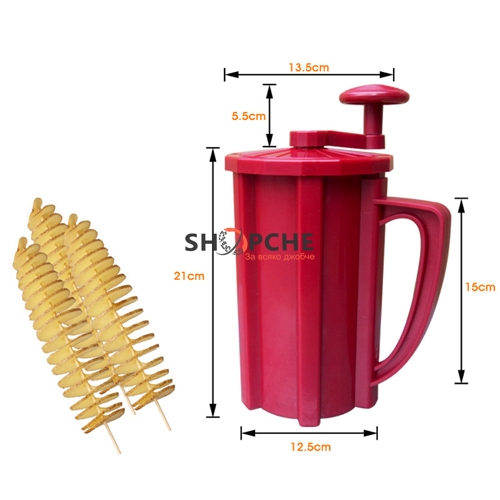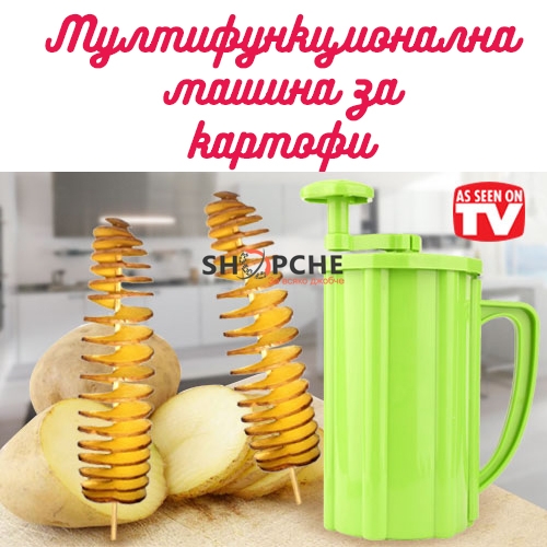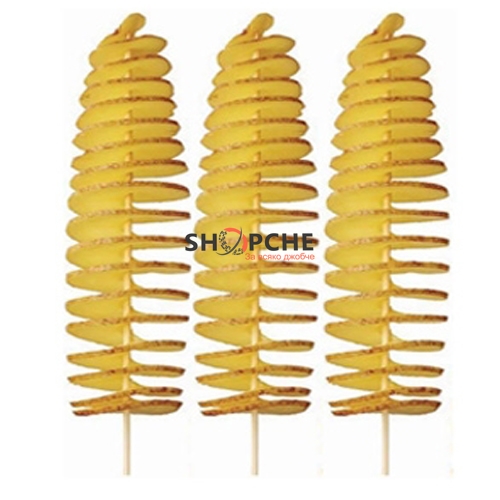 Машината за рязане на картофи на спирали е снабдена с лазерно заточените ножове, който позволяват обработката на един картоф – нарязване и нанизване на дървено шишче да става бързо, а получената атрактивна форма ще впечатли Вашите приятели и клиенти.