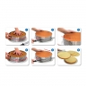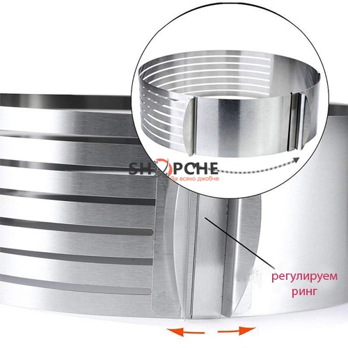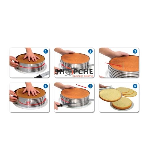Просто поставете върху хартия за печене и с помощта на регулируемата дръжка изберете размера на кекса по-ваше желание,след изпичане на сместа, прокарайте ножа, през прорезите и така ще имате 7 еднакви блата за перфектната торта!