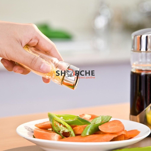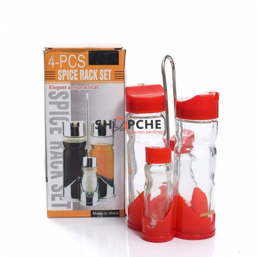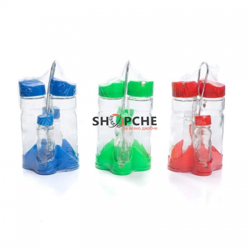 Дизайнът на стъкления оливерник от 4 части с поставка е изчистен и модерен, подходящи са както за използване вкъщи, така и в заведения и ресторанти. Всяко от шишенцата е изработено от сткъкло с пластмасови капачки.