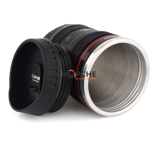 Страхотна чаша във формата на обектив, с капаче спомагащо за запазване на топлината на вашата напитка. (против изливане).