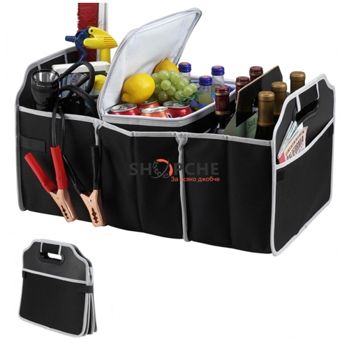 В комплекта на органайзера получавате също и термо чанта за съхранение на вашите изстудени напитки или топли сандвичи. Trunk Organizer е компактен и се съхранява без проблем в гардероба, веднага след като разтоварите органайзера. Спестете време и усилия при подготовката на семейната почивка. Органайзерът разполага с 3 отделения, лесно се сгъва когато не се използва и не заема излишно място. Trunk Organizer е със страхотен дизайн и е изработен от материали, които запазват за дълго време температурата на храните и напитките в него.