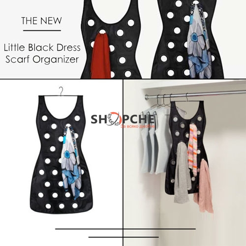 Шаловете и коланите са вашата голяма слабост? Искате още и още, но мястото за съхранение не достига? С органайзера Little Black Dress ще си спестите доста главоболия. Тази малка черна рокля заема минимално място в гардероба ви, като същевременно осигурява достатъчен брой отделения за вашите аксесоари.