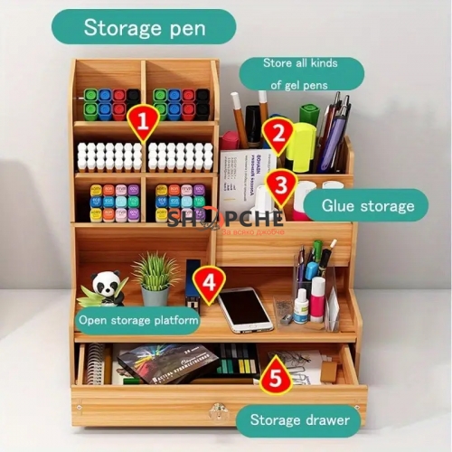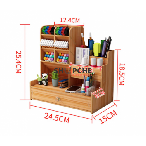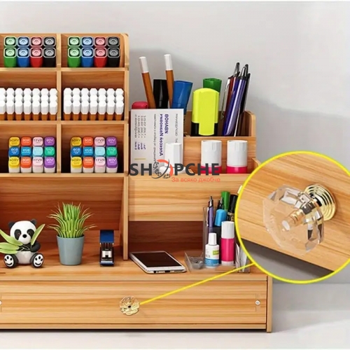 Този мултифункционален дървен органайзер за бюро е перфектното решение за подреждане на офис консумативи, гримове, дистанционни управления и други малки предмети. Със своите 12 отделения и едно чекмедже, ще държите всичко подредено и лесно достъпно.