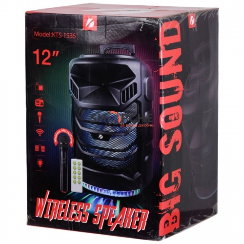 Безжична караоке тонколона с красиви LED светлини. За всички любители на музиката, професионалните музиканти ви представяме тонколоната с 12 инчове мощни говорители. Тя създава страхотно звуково усещане, музикална среда от чисти тонове, приятен и лек бас. Моделът е снабден с микрофон, който предлага два начина на свързване чрез кабел и безжично свързване, дистанционно управление с което сега лесно ще контролирате музиката си дори от разстояние. Продуктът е подходящ за подарък, както за малки така и за големи. Направете един страхотен подарък, който определено ще бъде в необходимост особено на феновете и почитателите на музиката.