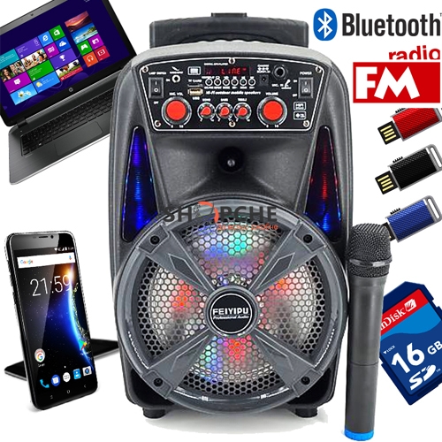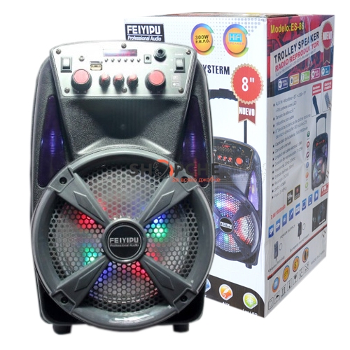 Уредбата за караоке FEIYIPU ES-86 разполага с вграден акумулатор, безжичен микрофон и възпроизвежда файлове Мр3 формат от USB флашка или SD карта, BLUETOOTH, РАДИО + СВЕТЛИННИ LED ЕФЕКТИ.