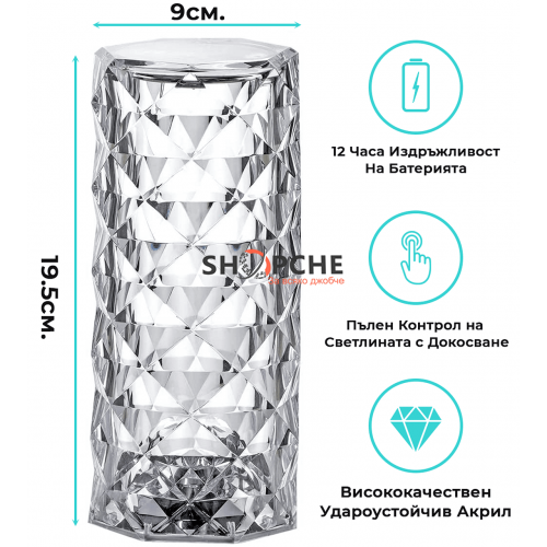 Тази кристална лампа е направена от акрил с вид на бели кристали, фокусирани към балансираната класическа красота. При модерната кристална лампа е обрнато внимание на визуалното въздействие и динамиката на формата, които създават очертания, без да подчертават структурната симетрия. Тя е подходяща както за нощна лампа, така и за украса и декорация на маси, секции и др.