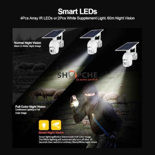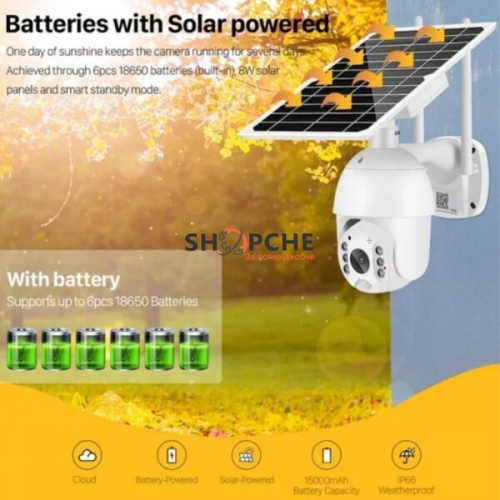 Kамера с вграден соларен панел и литиево-йонна Li-ion батерия, няма нужда от електричество, кабели или адаптери. С вградената Li-ion батерия, която се зарежда от соларен панел, тази IP камера е изключително лесна за инсталации и употреба.