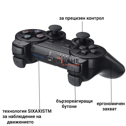 DUALSHOCK®3 използва технологията Bluetooth за безжично възпроизвеждане на игри и USB кабелът на контролера за безпроблемно и автоматично зареждане на контролера чрез PlayStation®3 по всяко време.