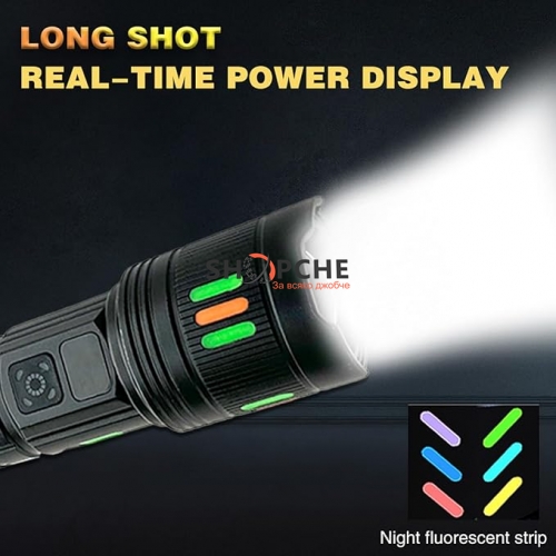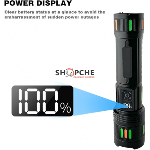 Фенерът разполага с 22 светещи ленти в различни цветове, което го прави не само функционален, но и стилен. Вграден LCD дисплей ясно показва оставащия заряд на батерията – винаги знаеш колко енергия имаш!