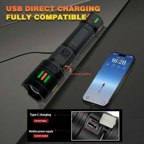 Фенерът работи до 20 часа с едно зареждане и се зарежда напълно за около 6 часа. Вградени са 2 USB порта – един за зареждане на фенера (Type-C), и един изход за зареждане на други устройства като телефон или слушалки. Идеален за използване на открито и при спешни случаи.
