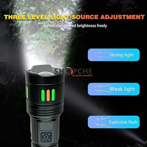 Този презареждащ се фенер е оборудван с усъвършенстван LED чип от ново поколение, който осигурява ултра силна и концентрирана светлина. Перфектен за осветяване на цяла стая, двор или пътека в планината. Идеален за къмпинг, разходки, риболов, планински преходи и аварийни ситуации.