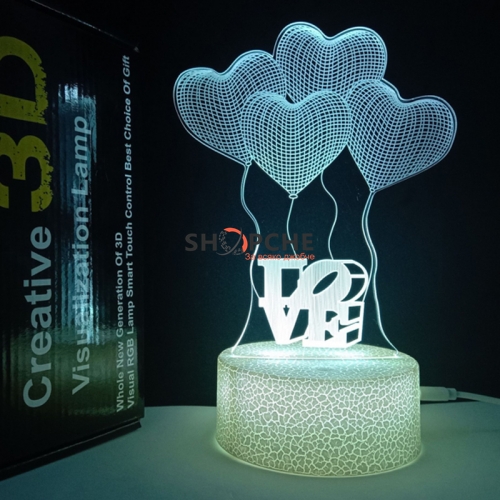 Декоративна 3D LED нощна лампа Love е красива 3D илюзия под формата на лампа. В началото ще видите романтичния дизайн с балони сърца и надпис Любов, но ако се приближите отблизо ще видите тънко акрилно стъкло, което е напълно плоско. Имате възможност да избирате между три вида бяла светлина, с която да свети лампата. Само трябва да натиснете веднъж електрическия ключ за запалване. Първият път ще светне един цвят, натиснете го отново, той ще се изключи и при следващи включвания и изключвания, вида на светлината ще се сменя.