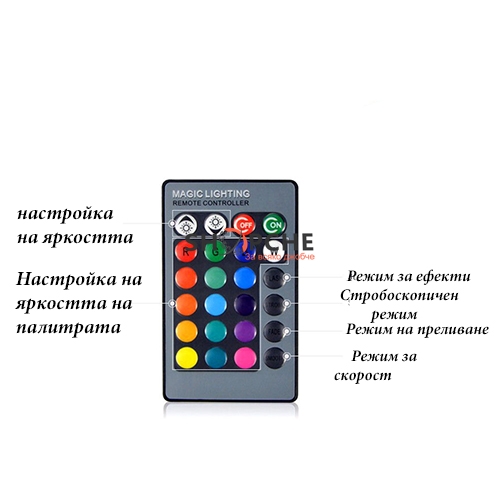 В комплекта има дистанционно управление, с което лесно ще можете да я загасите, смените цвета на осветлението или просто си направите мини дискотека.
