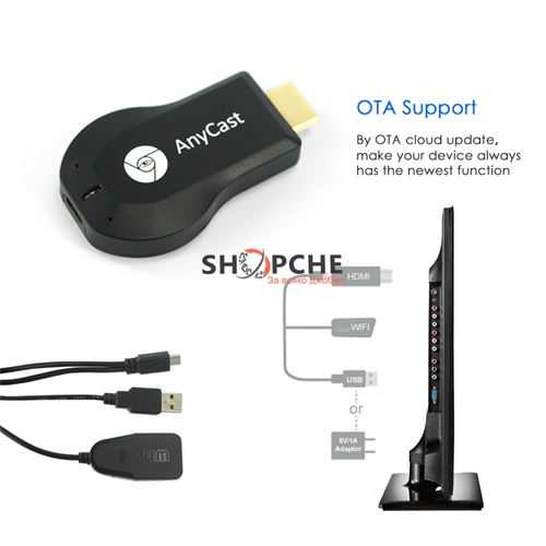 Свързването между Anycast TV Stick и телевизор става изключително лесно, с кабел или посредством WiFi връзка. Благодарение на вградената карта за безжичен достъп, Вие имате възможност да използвате всички стандартни интернет протоколи.