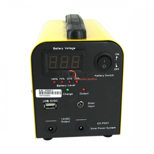 Преносимата кутия е оборудвана с акумулаторна батерия 12V/7Ah, соларен контролер 12V/5A, дигитален LED дисплей, показващ състоянието на акумулатора и входящото напрежение от соларният панел.Светодиодна индикация за състоянието на акумулаторната батерия в проценти. Вход за соларен панел, два изхода за DC 12V консумация, и изход DC 5V USB порт.