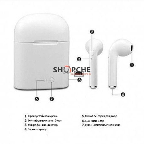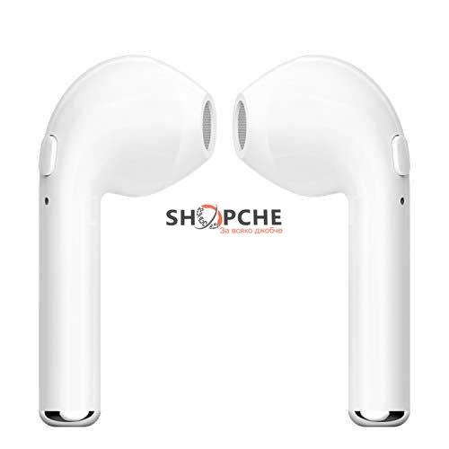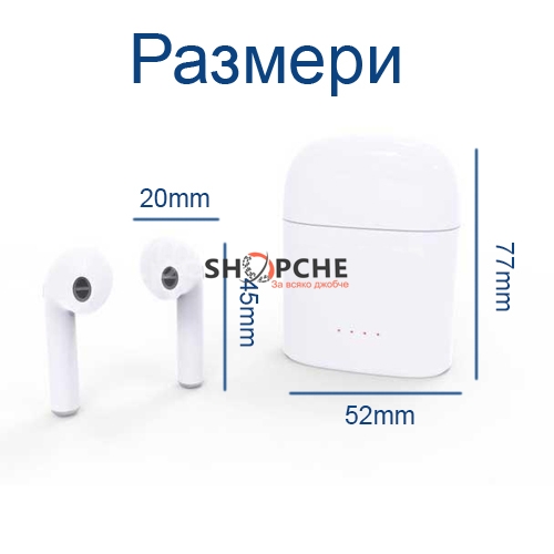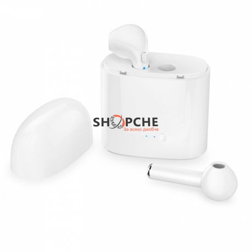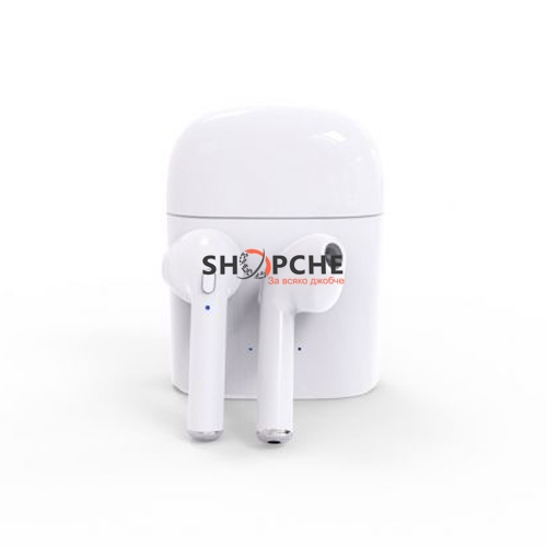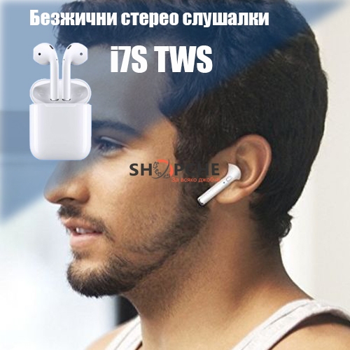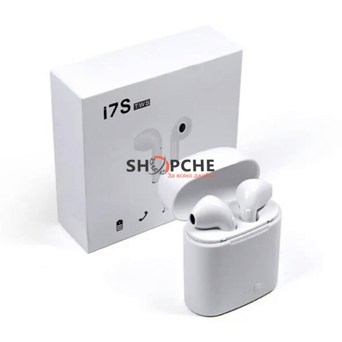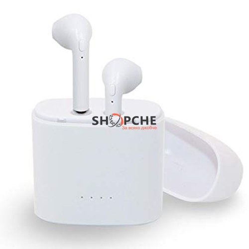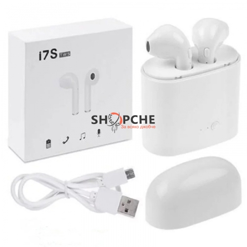 Представяме Ви безжични стерео слушалки i7S с bluetooth 4.2+edr комплектът е със станция за зареждане с вградена батерия и USB кабел за зареждане.