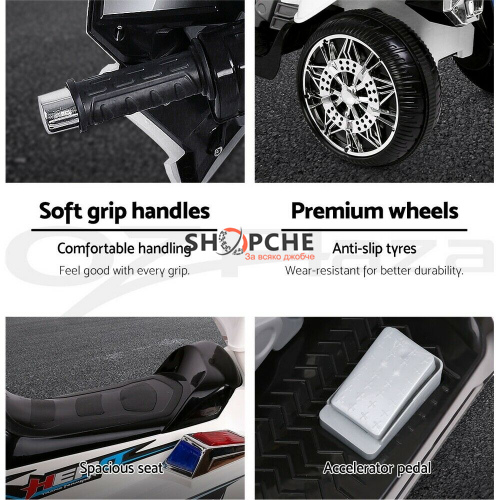 Акумулаторен мотор с 12V батерия, меки гуми и кожена седалка.