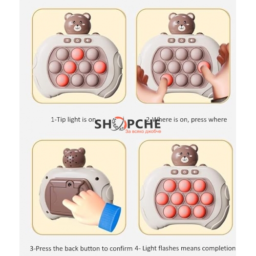 С автоматичната си функция, тази игра добавя още едно ниво на забавление. Децата могат да наслаждават на удовлетворителното чувство от натискане на мехурчета и в същото време да развиват координацията на око-ръка, фината моторика и способността за концентрация.