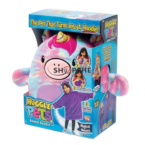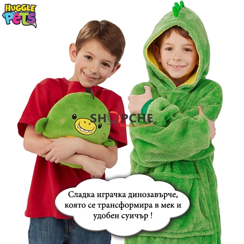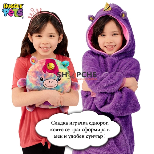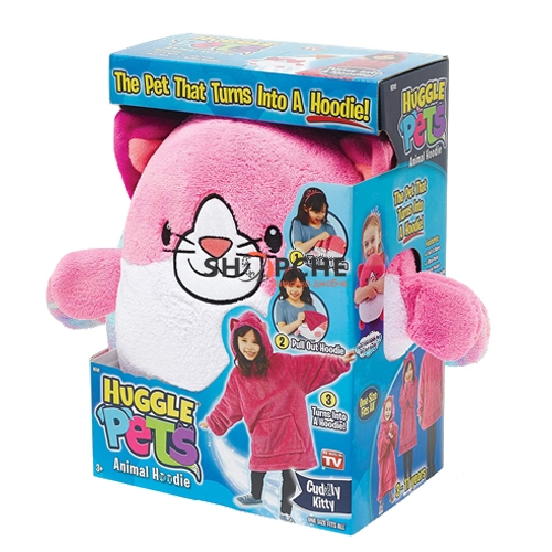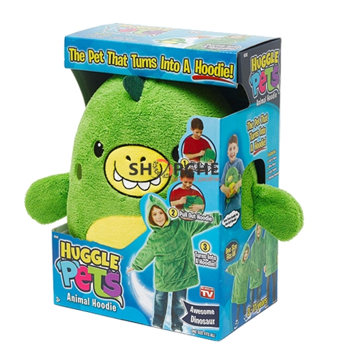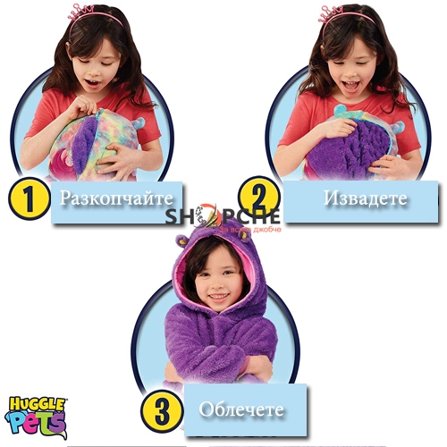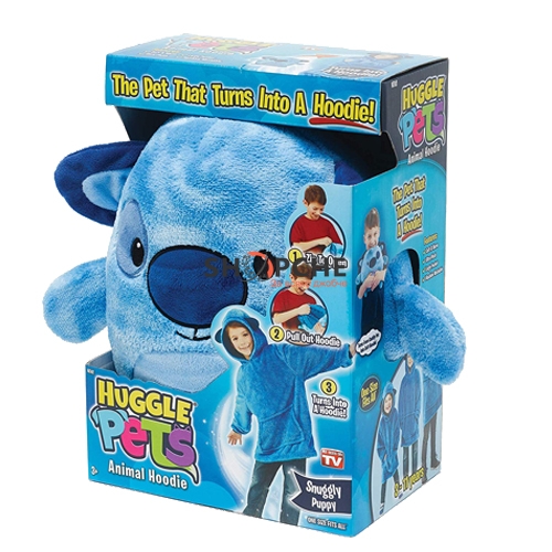 Той се съхранява като плюлена играчка, но се разгъва в ултра мек и супер топъл суичър! Huggle Pets Hoodie се сгъва магически в качулката и закопчава сигурно вътре!