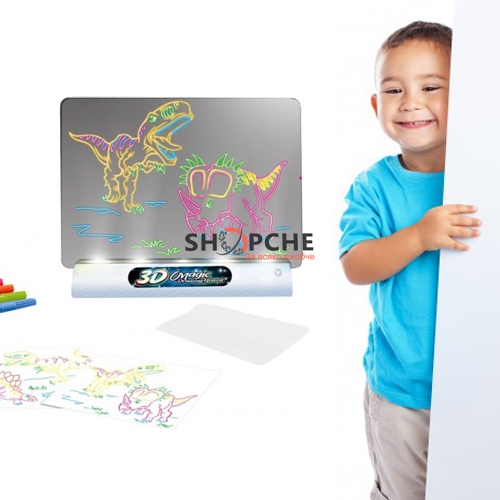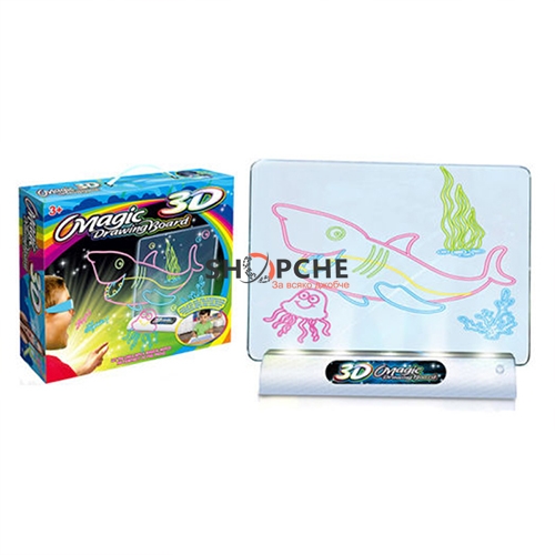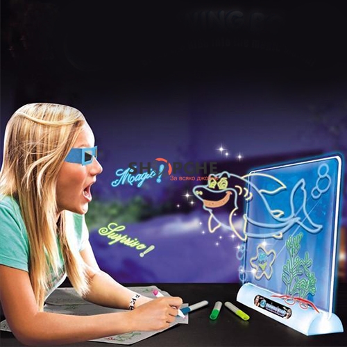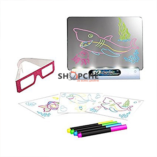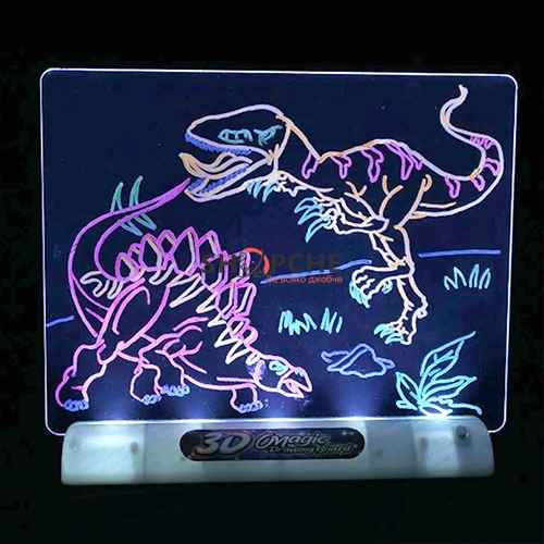 Пригответе се за истинско 3D приключение с вашите рисунки. Просто прекопирайте рисунките на динозаври, които ще намерите в пакета върху прозрачната пластмасова дъска с флоуресцентните маркери от различни цветове.След което поставете дъската върху LED поставката. Сложете оч илата и се потопете в света на 3D. Не само това, децата могат да нарисуват, каквато рисунка си пожелаят, на който и да е анимационен герой или прекопират някоя друга рисунка от книжките или Вашия таблет, използвайки маркерите и просто да сложат 3D очилата и да се наслаждават на преживяванията. Дъската може да бъде почистена и да се ползва отново и отново.
