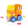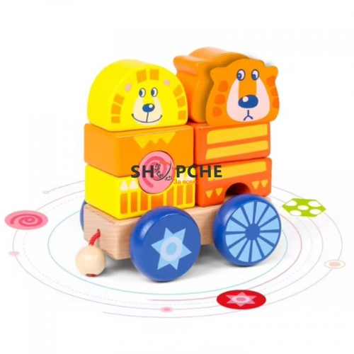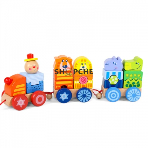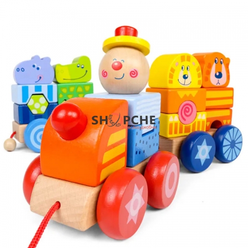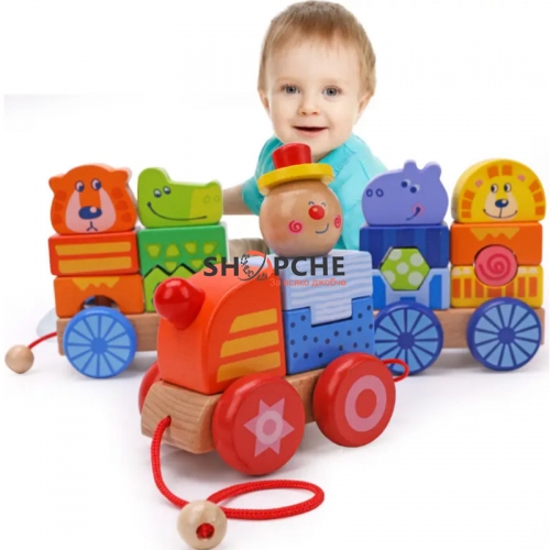 Включва три вагона с цветни фигури, които образуват локомотив.
