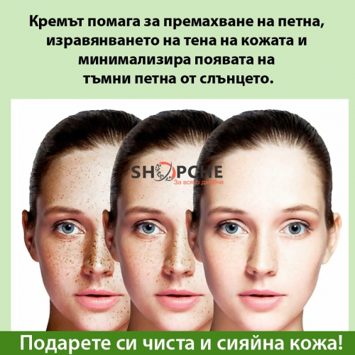 Кремът помага за премахване на петна, изравняването на тена на кожата и минимализира появата на тъмни петна от слънцето.