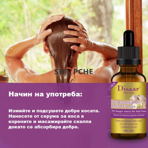 Нанесете от серума за коса в корените и масажирайте скалпа докато се абсорбира добре.