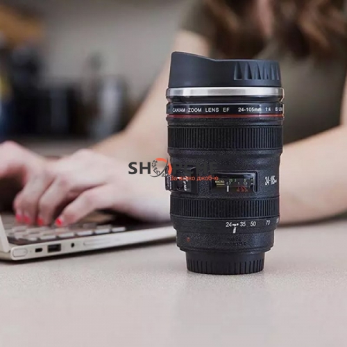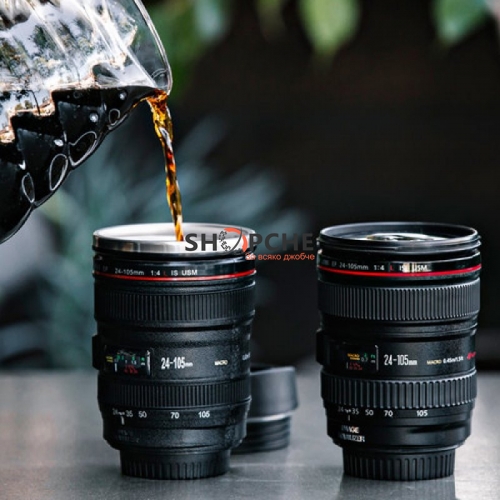 Страхотна чаша във формата на обектив, с капаче спомагащо за запазване на топлината на вашата напитка. (против изливане).