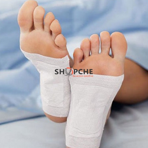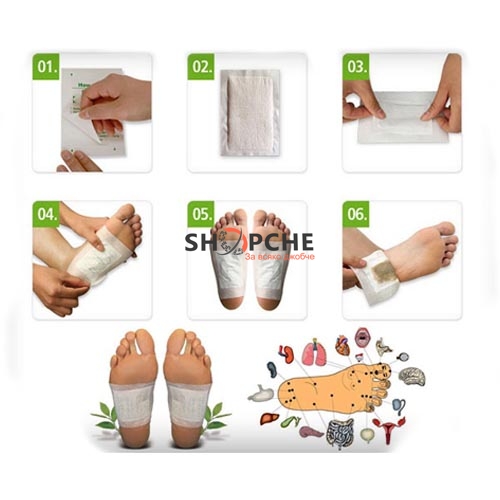 Отлепете хартията от широкия, фиксиращ пластир и залепете пликчето с детоксикиращото съдържание в средата му, с едноцветната страна към стъпалото