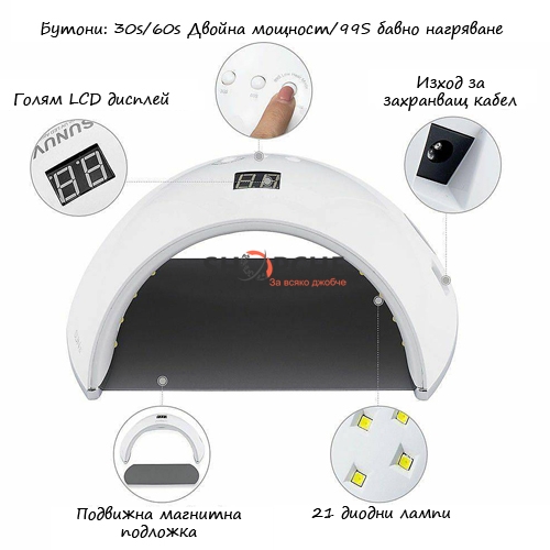 SUN 6 е с 21 диодни лампички, стратегически разположени, така че да изпекат равномерно гела, лака или друго, което сте нанесли върху ноктите.
