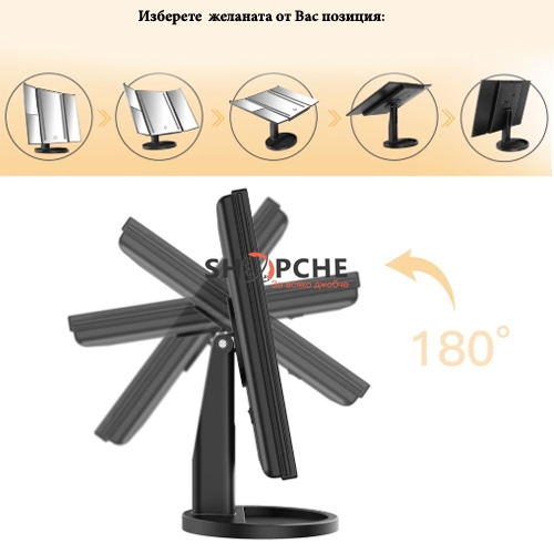 Стойката за огледало за грим позволява въртене на 180 градуса, така че да можете да регулирате огледалото според подходящия ъгъл на гледане, за да задоволите вашите нужди и предпочитания.