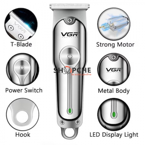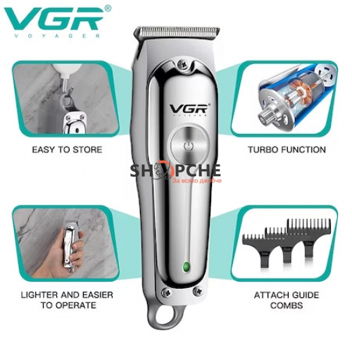 Машинките за подстригване на марка VGR са изключително качествени и надежни.Притежава стоманено острие, за да осигури бързо и ефективно бръснене или подстригване. Машинката включва три приставки с различни размери и предпазител на острието, с които можете лесно да контролирате дължината на косата, която искате да подстрижете и да създавате различни прически. Машинката се зарежда посредством USB кабел включен в комплекта. Дизайнът на тримера е изчистен и елегантен.