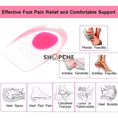 Меката подложка, изработена от гел, плътно прилепва към петата; спомага за успокояване на болката в областта на ходилото и създава чувство за комфорт при стъпване; омекотява натиска върху петата при продължително стоене или ходене.