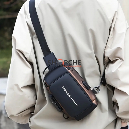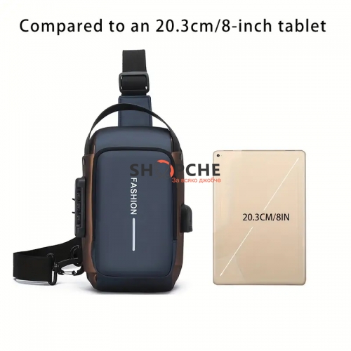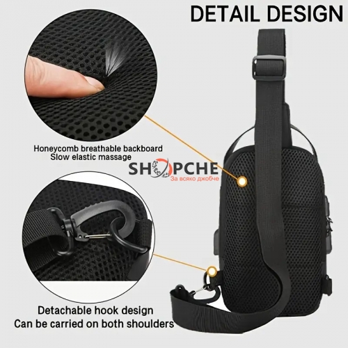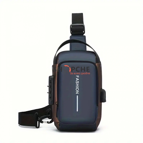 Удобна и стилна мъжка чанта за гърди с USB порт. Подходяща за пътуване, градски стил и ежедневие. Водоустойчива, с голям капацитет.
