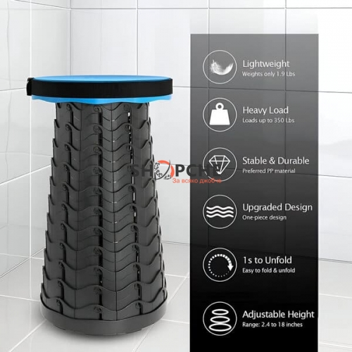 Сгъваемата табуретка е незаменима за опитния любител на къмпинга, туриста или пътешественика. Забравете за неудобните столове и се насладете на удобството, където и да сте. Табуретката е идеална за дълги опашки в увеселителни паркове, партита, фестивали и много други събития.