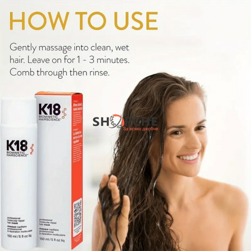 Нанесете обилно върху чиста и влажна коса (без употребен балсам) и оставете маската за 4 минути.